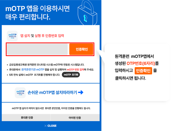 STEP 03 원격훈련 mOTP앱에서 생성된 OPT번호(6자리)를 인증화면에 입력합니다.